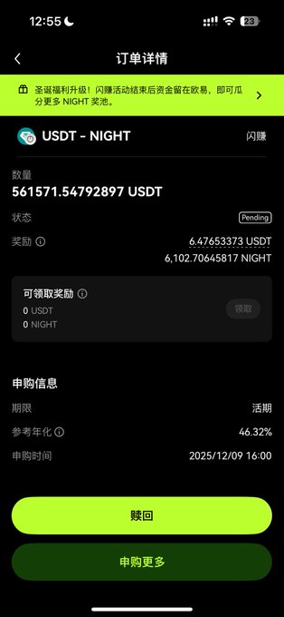 #OKX 這輪閃賺的收益率相當不錯,格局很大! 算了一下,下午4點鐘開始,到現在12點,8個小時,56萬刀,給了6100個 $Night ,以現在0.04的價格計算,244美金,1708RMB,真的很香。可惜200萬刀額度,沒能塞滿!😅 問題是,現在還能保持46.3%的收益率,已經相當不容易!🧐 twitter.com/Rocky_Bitcoin/stat...