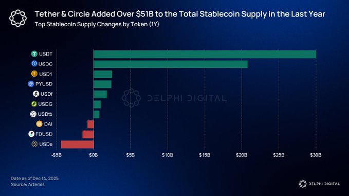 2025 年系列最重要的圖表: 光是去年, USDT就增加了 300 億美元。 USDC緊隨其後,貢獻了 208 億美元。 這約佔 USDT 總供應量的 18%,約佔USDC總供應量的 33.5%,兩者均在過去一年內鑄造。 重大消息。