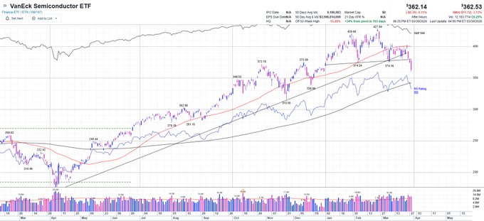 半導體板塊今天跌破了其4個月頭肩頂形態的支撐位,我上週已經略有提及,但值得再次強調。儘管半導體板塊正接近支撐位,但這仍然是一個明顯的短期阻力,因為軟體板塊自2月份以來已經完成了一輪循環,而SOX板塊今天也跌破了支撐位。 #IBD圖表來自@IBDinvestors @marketsurge 今晚我將討論半導體和軟體板塊,以及4月需要密切關注的短期低點。