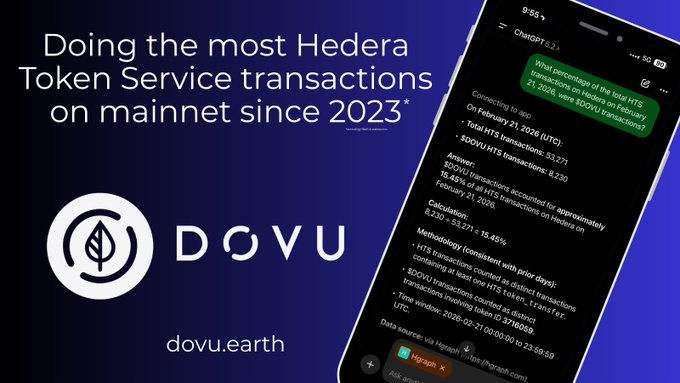昨天在Hedera網路: 2026年2月21日 $DOVU 交易佔 @ Hedera主網HTS 總交易量的 15.45%。 來源:@hgraph 開發模式的 ChatGPT 5.2 更多資訊請參考下圖↓