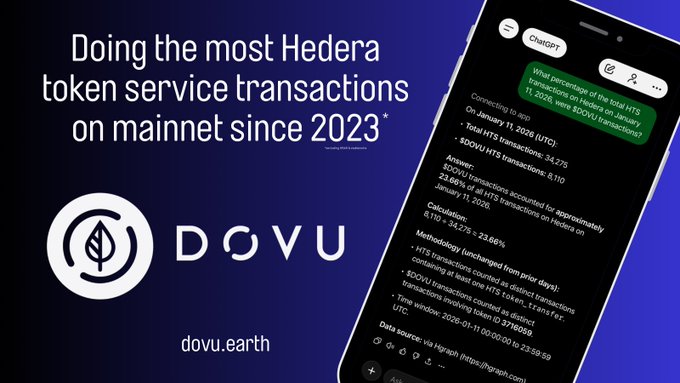 昨天在Hedera網絡上: 2026年1月11日 23.66% 的 HTS 交易是 $DOVU 交易。 詳情請見下圖↓ 來源:@hgraph 開發模式下的 ChatGPT 5.2