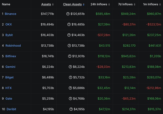 幣安破產了? ! 🚨 康乃狄克州到處都是這種恐慌情緒,但數據卻顯示截然不同的情況。大多數中央交易所都顯示資金流入,而不是流出。 過去7天,幣安淨流入資金9.5億美元, Bitfinex緊追在後,淨流入資金9.45億美元。 只有OKX和 Gate 出現了輕微的資金流出。 這個故事的寓意是:不要輕信社群媒體上的一切。