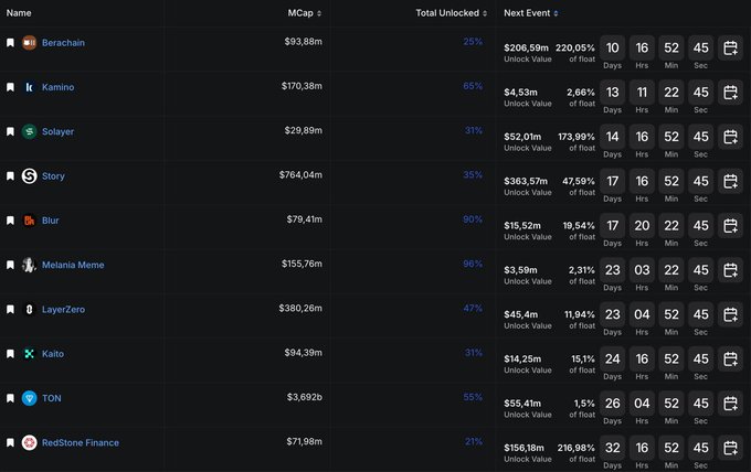創投即將迎來豐厚回報! 📉 🔓 二月主要代幣解鎖: 2月6日 - $BERA:2.065億美元 🚨 2月9日 - $KMNO:450萬美元 2月10日 - $LAYER:5200萬美元 2月13日 - $IP:3.635億美元 🚨 2月13日 - $BLUR:1550萬美元 2月18日 - $MELANIA:350萬美元 2月18日 - $ZRO:4540萬美元 2月20日 - $KAITO:1420萬美元 2月21日 - $TON:5540萬美元 2月28日 - $RED:1.561億美元 🚨 價格上漲只是為了做空嗎?