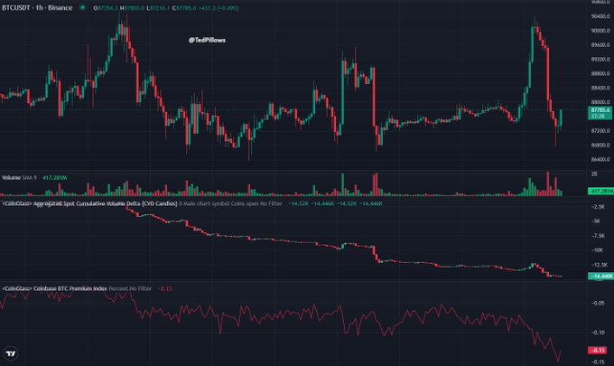 $BTC 現貨CVD呈下降趨勢。 Coinbase比特幣溢價已轉為負值。 情況不妙。