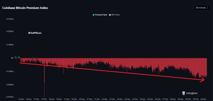 Coinbase比特幣溢價未見覆蘇跡象。 機構投資者仍在積極拋售比特幣。