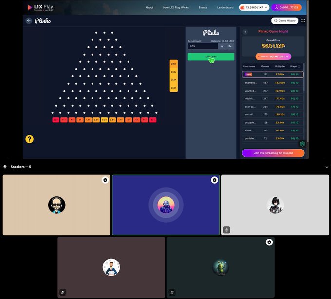 L1X 遊戲之夜圓滿成功!🚀 數百名玩家到場,數千場在線遊戲實時進行。競技場內的氣氛無與倫比!⚡️ 熱烈祝賀冠軍榮登榜首!🏆 精彩活動仍在繼續!您現在仍然可以在 L1X Play 上暢玩 Plinko 和其他技巧遊戲。 點擊此處開始遊戲 👇 play.l1xapp.com #L1X #GameFi #Web3Gaming #Bullish