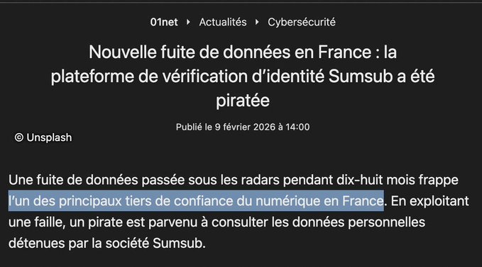 以下是即將發生的事情: 2026年:法國將通過一項法律,要求公民在存取社群媒體時必須驗證身分。 同樣在2026年:國家批准的身份驗證平台將遭受資料外洩(或駭客攻擊,或兩者兼有)。 此外,在2026年:數百萬法國公民的個人資料將在暗網上公開。 祝大家今天愉快!