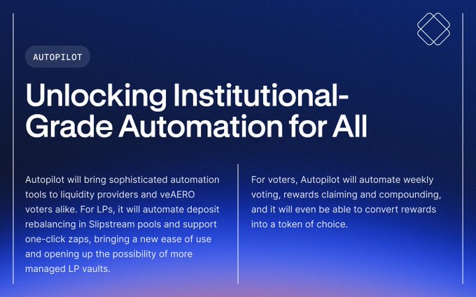透過 Autopilot,Aero 將為所有人解鎖易於使用的機構級自動化功能: 🗳️ 自動投票 ⚡ 自動流動性提供者再平衡 + 快速入場 ✈️ 自動複利 ☑️ 自動轉換 簡單高效。這才是 DeFi 該有的樣子。