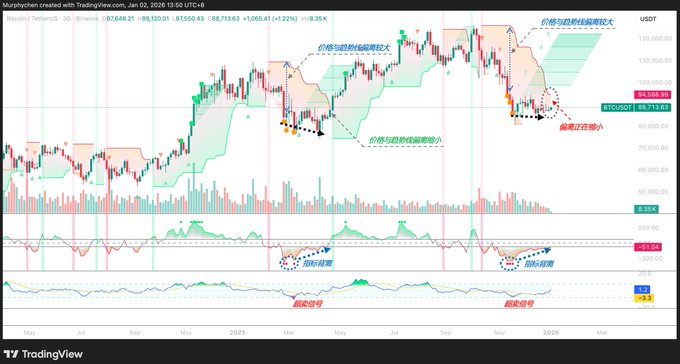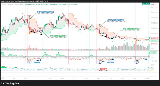 當前BTC的3日K和趨勢指標出現了背離形態,意味著在該級別中的下跌勢能正在被逐漸吸收。在第一個紅點出現時下跌勢能最強,此後價格盤整,指標逐漸迴歸中軸,產生背離。