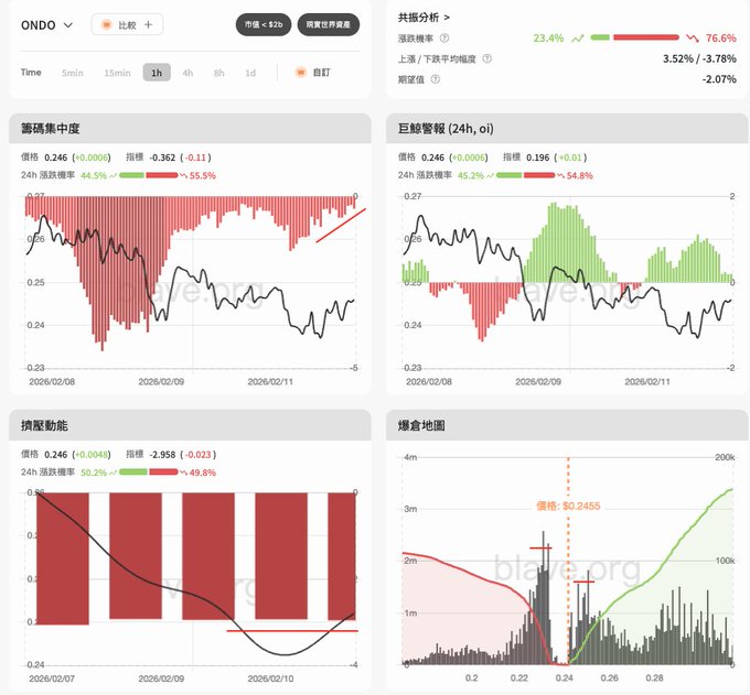 $ONDO 與 @chainlink 展開展開合作,開始讓鏈上 RWA 資產接入 DeFi 基礎設施,現在如 QQQon、TSLAon 代幣可以再以太坊做抵押進行借貸...🔥 數據面來看... $ONDO 開始顯現支撐,空頭籌碼集中度在昨天不斷下降,巨鯨開始更多參與做多,空頭動能持平多日,整體偏向區間整理為主,可關注爆倉牆兩邊的突破行情! twitter.com/__Blave__/status/2...