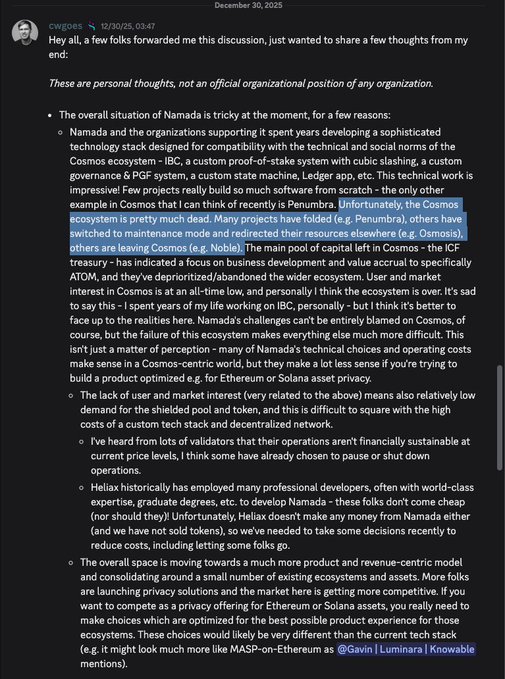 該死。 “很遺憾, Cosmos生態系統幾乎已經消亡。許多項目已經關閉(例如 Penumbra),其他項目已轉為維護模式並將資源轉移到其他地方(例如Osmosis),還有一些項目正在離開Cosmos (例如 Noble)。”