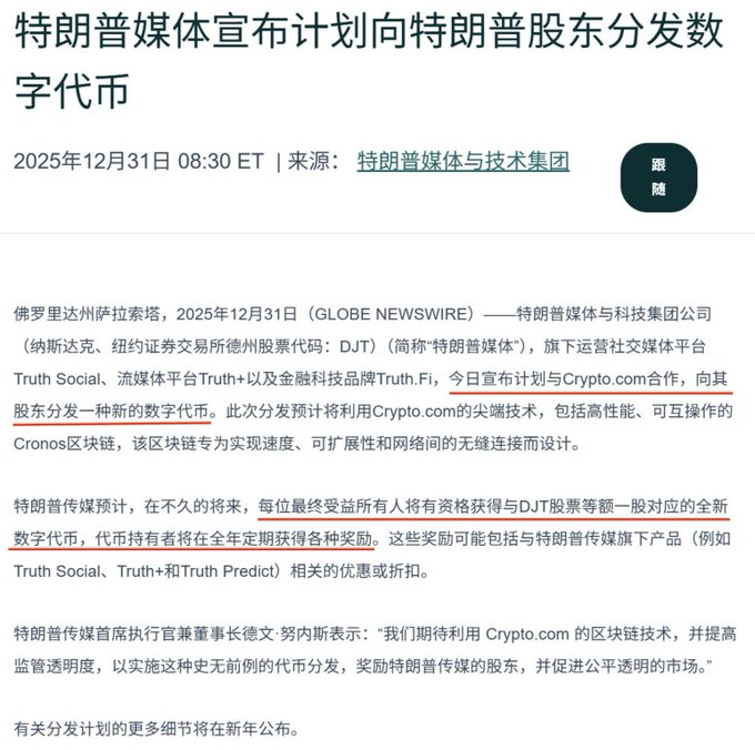 我去……特朗普又要發幣了 特朗普上一個幣 $TRUMP ,全年跌超90%。 特朗普夫人發幣 $MELANIA ,暴跌99%。 這是新年發新幣,準備再割一輪新韭菜了?