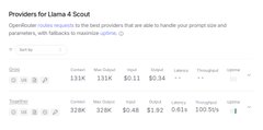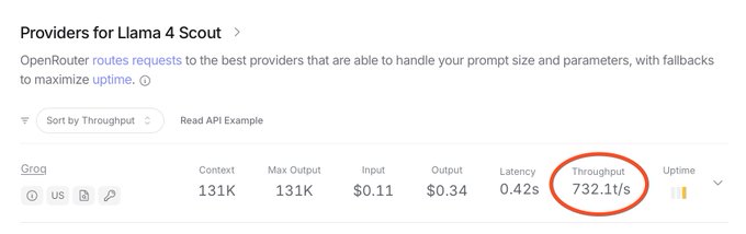 Llama 4 提示:在任何 slug 末尾添加“:nitro”即可獲得最快的提供商 @GroqInc 每秒獲得 732 個代幣,價格最低👀 twitter.com/OpenRouterAI/statu...