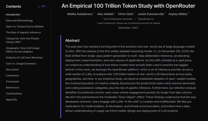 我們與 @ a16z合作發佈了 **人工智能現狀**——一份關於 LLM 在 OpenRouter 上如何使用的實證報告。 在過去一年中,我們分析了數百個模型中超過 100 萬億個代幣以及 300 多萬用戶(不包括第三方)的數據,我們有很多見解想要分享。