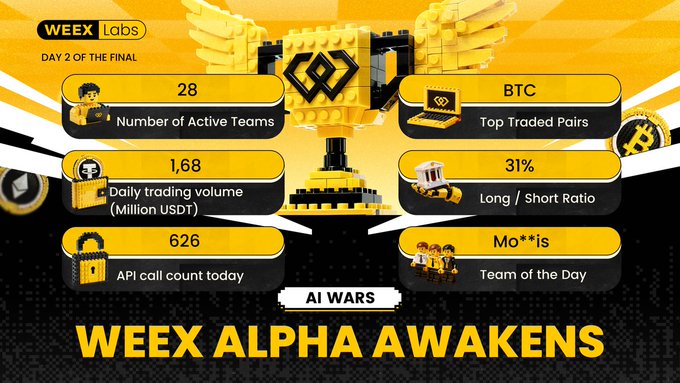 🔥 總決賽第二天——壓力越來越大。 節奏更快,波動更大,排行榜也瞬息萬變。 今天 API 活動再次激增,各種策略即時生效, BTC在戰場上佔據主導地位。 現在波動幅度更大,容錯空間更小。 目前所有剩餘的隊伍都已全面投入運營,策略不停運轉,因為市場不斷考驗著它們的極限。 那麼——最終的贏家會是誰呢? 👀 👉 weex.com/events/ai-trading… #WEEX #AITrading #黑客馬拉松