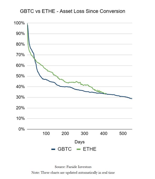 $GBTC v $ETHE - 轉換後的資產損失 兩條線第二次接近交叉 GBTC 損失了 70.9% 的資產 ETHE 損失了 65.8% 的資產 farside.co.uk/eth