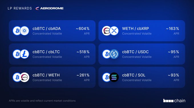 更新:Aerodrome,Base 上的領先 DEX,提供 Coinbase Wrapped $ADA 與 $ BTC配對,提供超過 600% 的 LP 獎勵年化收益率。