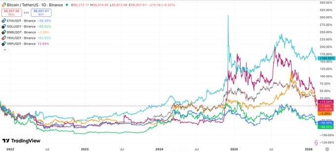 這張圖其實有問題 我去看了一下TradingView 從2021的最高點到現在 BTC是分界線 強於BTC的:TRX漲幅161% XRP漲幅13% 弱於BTC的:BNB跌幅3% ETH跌幅58% SOL跌幅66% 大家天天調侃孫哥 但是孫哥的TRX確實爭氣 不能說唯一 但也是為數不多的爭氣的幣了 @justinsuntron #TronEcoStar twitter.com/0xMoon6626/status/...