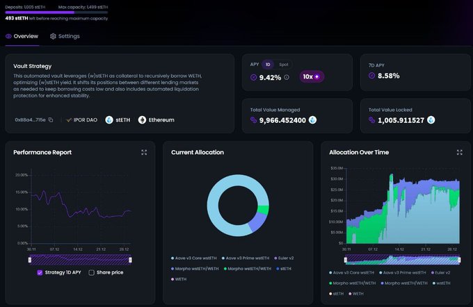 有些策略悄無聲息地發揮作用,只有當容量不斷被填滿時你才會注意到。 其中之一是 @ipor_io 利用 stETH 構建的金庫,該金庫剛剛再次擴容。 它的獨特之處在於其運作機制。 該金庫代表用戶管理槓桿化的stETH循環…… 它會在Aave和 @Morpho 等協議之間輪換債務,以確保獲得最佳借貸成本。 換句話說,它是通過轉移債務而不是頭寸來優化收益的。 本質上是一個借貸利率聚合庫。 目前ETH的年化收益率約為 9.42%,這很難找到。 安靜、高效,而且顯然很受歡迎。