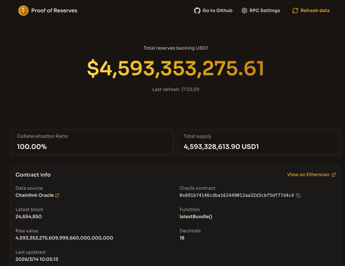 週末行情低迷,中東地緣還在繼續,油價仍居高不下。不知道週末會不會又整什麼么蛾子,市場情緒已經極度恐慌。 還是希望月內可以結束吧。我持倉的 #USD1 的理財活動。也已經倒計時了。還有6天截止。不知道能不能繼續續杯啊。且看官方動作了。 USD1的實時鏈上儲備證明,用戶可以隨時驗證其總供應量、儲備資產以及抵押率。100.00% 的抵押率,然後Chainlink Oracle 每分鐘自動化更新查看。作為持有者,這種透明度實時監控是我們普通用戶能安心樂見的。 而且USD1一直在拓展實用新場景。MyriadMarkets是首個由USD1驅動的預測賽道。不得不感嘆,USD1 的生態系統範圍一直在不斷壯大啊。 作為普通用戶在熊市階段,希望能繼續續杯啦。哈哈