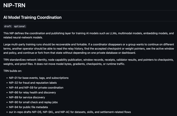 Nostr NIP-TRN 初稿:AI 模型訓練協調 NIP:github.com/OpenAgentsInc/opena...… 參考實現即將發佈到 Psionic:github.com/OpenAgentsInc/psion...… 歡迎反饋和共同開發! twitter.com/OpenAgentsInc/stat...