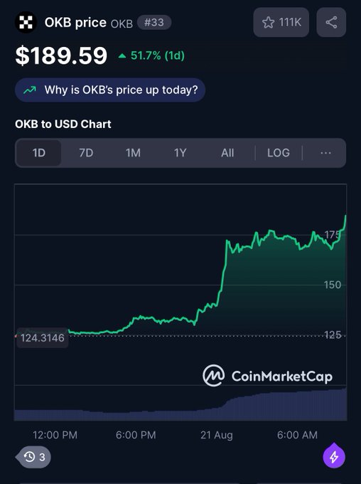 $OKB 今天飆升至 189 美元!距離我們 250 美元目標價仍有一半的差距 @okxchinese twitter.com/MulanaVC/status/19...