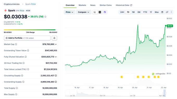 $SPK 自從 kelpdao 駭客事件後Aave達到 100% 利用率以來,已經飆升了約 40%。 流動性現在正從Aave遷移到 #spark,因為它已成為存放閒置資產的第二選擇。 如果Aave退出市場,哪個協議將接管借貸領域的主導地位? 目前,我只看到兩個競爭者。 – $morpho – @sparkdotfi 你覺得呢? twitter.com/Kaffchad/status/20...