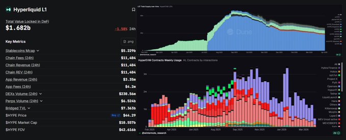 超流動性已經很大了,但如果你看TVL的話,它的#HyperEVM還處於早期階段。 鏈上約有 17 億美元資金,最近基本持平,但考慮到非法交易量每天接近 67 億美元,這個數字具有誤導性。 但這仍然是鏈上早期交易所層面的交易流程: – 每日交易量 23 萬 – 每天新增 2000 個地址 – 總計 110 萬個錢包 – 26.5M LST $HYPE 每週現貨去中心化交易所交易量達15億美元 與其他日交易量達數百萬筆的連鎖銀行相比,它還遠遠落後。但他們顯然押注於這裡正在形成某種趨勢: – 總計61萬份合同 每天新增 1.2k 個 讓我們看看開發者們在開發什麼。 > @Kinetiq_xyz:通過 kHYPE 引領流動性質押,TVL 達 9.16 億美元,約佔鏈 TVL 的 53.8%。 @tradexyz:累計成交額達1560億美元,未平倉合約峰值達24億美元,主要交易品種為股票、石油、黃金和白銀。年化收入為4550萬美元。 @BasedOneX:24小時內交易額達4820萬美元,過去30天內達16.5億美元,年化手續費收入達960萬美元,推動了協議回購(最近回購了兩次)。他們發行的Visa借記卡可在超過9000萬家商戶使用。 @felixprotocol:總鎖定價值 1.68 億美元,HyperEVM 原生合成美元。穩定器本身每日惡意交易量 295 萬美元,每月手續費 40.2 萬美元。 @hyperbeat:最大的收益聚合平臺,總鎖定價值達 6400 萬美元,累計收入達 248 萬美元。 該生態系統大約在一年前啟動,許多新穎的策略(delta 對沖金庫、代理ARB機器人、合成 #RWA)在技術上是可行的,但尚未經過生產驗證。 我認為,#HyperEVM 仍在努力成為加密貨幣領域活躍鏈上交易者的最佳平臺。