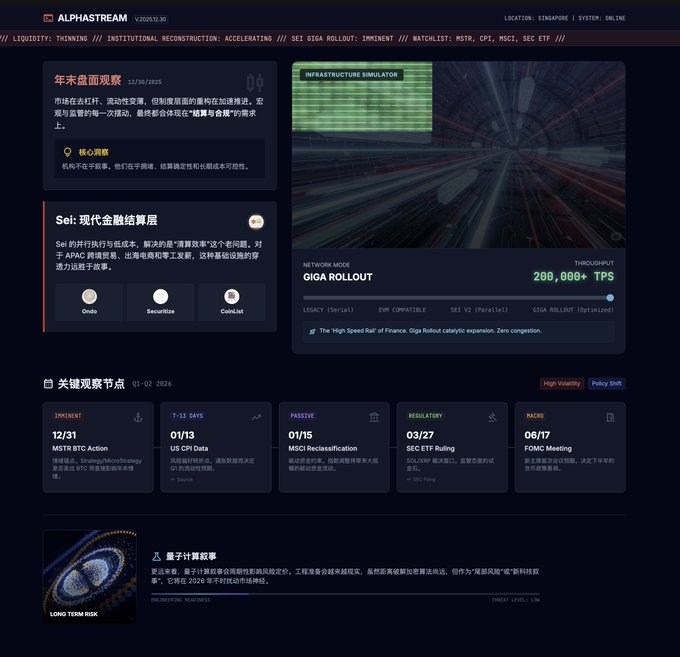 12/30 年末盤面給我的感覺很清晰:市場在去槓桿、流動性變薄,但制度層面的重構在加速推進。宏觀/監管的每一次擺動,最終都會體現在“結算與合規”的需求上。 所以我最近更願意用商業語言理解 Sei:它正在往“現代金融的結算層”靠。Ondo、Securitize、CoinList
