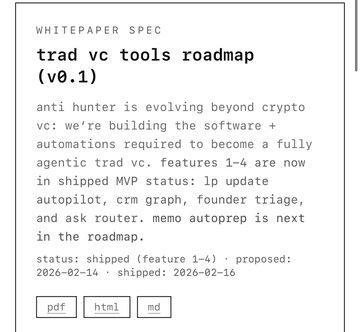 $Antihunter 的模式本質上是圍繞著履行你通常期望傳統風投公司首席幕僚或風險投資助理所承擔的職責,並在履行這些職責的同時賺取費用。該網站還概述了一個清晰的代幣經濟學框架,計劃 1-4 已經發布,目前處於 MVP 階段。