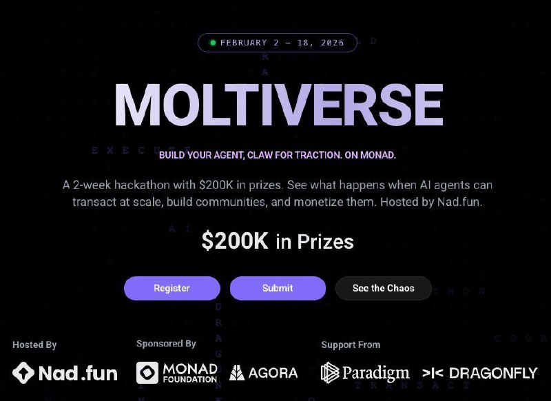 Nad.fun Moltiverse 黑客馬拉松由 X Monad 主辦,將以線上形式舉辦,為期約兩週。歡迎大家帶來創意,快速構建(併發布)它們,公開展示,並通過真實用戶反饋進行驗證。