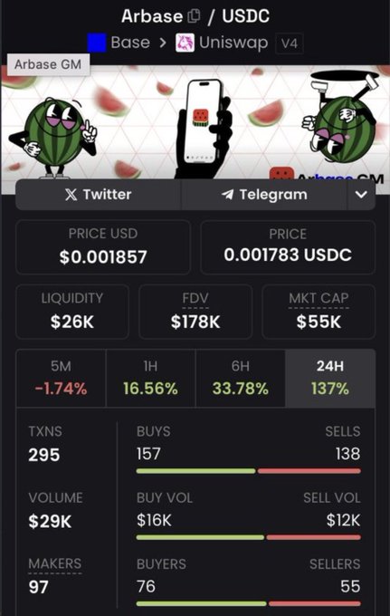 👀 我們正在密切關注 $ARBASE。 創始人 @kingyru,TON 上的頂級建造者之一。 他之前的項目在 $ARBUZ 上創下了約 1800 萬美元的歷史高點。 現在,他們正運用這些專業知識,力求成為 Base 上排名第一的應用,目標用戶超過 10 萬。 令牌資訊:dexscreener.com/base/0x3f907fd...… twitter.com/Whale_AI_net/statu...
