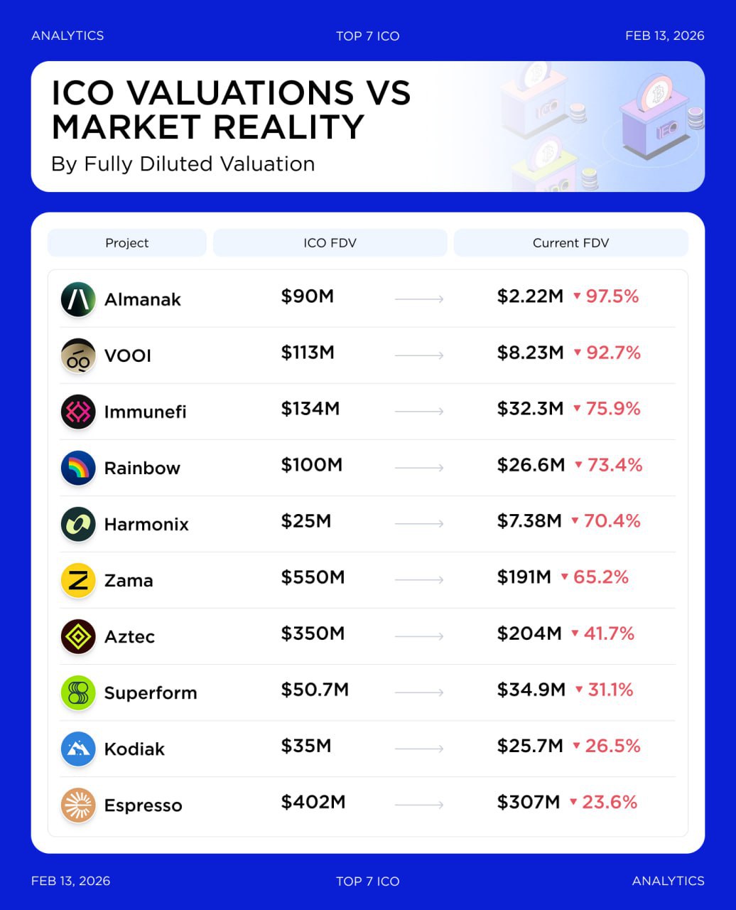ICO估值與市場價值 大多數項目上線的估值仍然無法反映當前的市場狀況。ICO的初始發行價(FDV)數字雖然看起來很誘人,但市場總會在融資輪結束後不斷調整這些預期。 ICO價格與當前市場價值之間的差距正在擴大: $ALMANAK 9000萬鎂→ 222萬鎂(-97.5%) $VOOI 1.13億鎂→ 823萬鎂(-92.7%) $IMU 1.34億鎂→ 3230萬鎂(-75.9%) $RNBW 1億鎂→ 2660萬鎂(-73.4%) $HAR 2500萬鎂→ 738萬鎂(-70.4%) $ZAMA 5.5億鎂→ 1.91億鎂(-65.2%) $AZTEC 3.5億鎂→ 2.04億鎂(-41.7%) $UP 5070萬鎂→ 3490萬鎂(-31.1%) $KDK 3500萬鎂→ 2570萬鎂(-26.5%) $ESP 4.02億美元 → 3.07億美元 (-23.6%)
