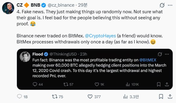 CZ:幣安從未在BitMEX上進行過交易。據我所知,BitMEX每天只處理一次提現。 #幣安