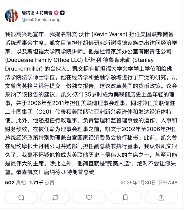 前腳剛說完,這次特朗普沒有放鴿子直接宣佈了提名人選,凱文·沃什被提名新任美聯儲主席,既然排除了我第二個質疑,接下來就看第一點了。 後續我們需要注意沃什是否會作為未來主席是否開始發表講話,配合貝森特來提振美元信心。 目前宏觀市場主要敘事中,政府停擺雖然懸而未決,但是目前特朗普出現與民主黨溝通後,大概率會避免政府大規模停擺,今晚的12月PPI數據影響權重不高,今晚的市場將會圍繞新任美聯儲主席來進行定價交易。 市場預期,沃什不會支持大幅度連續降息,且貨幣政策上秉承著收縮流動性,這種預期對於風險市場是不利的,但是對於美元美債信心是有提振效果的,看稍後到美區交易時間是是否會對此進行定價。 其實沃什被提名,除非是一改之前的觀點,否則目前來看對於風險市場以及降息來說,還不如鮑威爾。 twitter.com/CatoKt4/status/201...