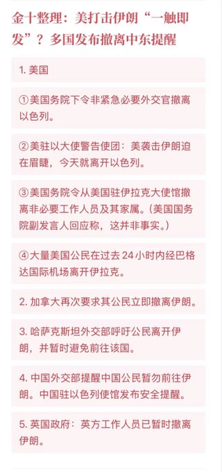 美伊地緣風險再度上升,多個國家開始呼籲居民撤離,真的要開打?美國針對伊朗的首要打擊目標是哪些? 截止目前最新消息,多個國家開始呼籲撤離居民,特朗普表示不得不打的態度,這個週末地緣風險再度成為潛在威脅! 福特航母已經停靠以色列海港,名義上形成中東雙航母局勢,雖然中東國家表示不允許使用本國機場直接襲擊伊朗,但是美國已經準備了超過200架加油機為可能存在的空襲做準備 這種明白可能襲擊的狀態,意義到底在哪?個人分析無非兩點: 1,軍事施壓,試圖讓雙方談判之後伊朗可以更好的妥協,阿曼方面雖然進行了居間調節避免了雙方直接發生外交衝突,但是一旦伊朗保持談判強硬態度,軍事施壓勢在必行,也是必須要打的牌,畢竟美國在中東的軍事佈局已經形成,不用可惜。 但是這並非真的要打,而是形式意義大於實際意義,很有可能是美國故意釋放可能襲擊信號,讓各國呼籲居民撤離,短期讓可能襲擊的情緒瀰漫整個伊朗,軍事承壓,必然會在協議上妥協讓步,更好的完成談判協議。 2,真實襲擊,從情緒施壓到真實的軍事施壓。既然軍事佈局已經完成,情緒施壓如果無效,美國不排除可能直接襲擊伊朗的可能性,但是如此“名牌”襲擊,不用指望可以襲擊關鍵性目標,例如伊朗高層,例如濃縮鈾的存儲地,例如導彈庫,例如核研究實驗室。 經歷了去年6月份的空襲,再次名牌軍事打擊伊朗必然會防備,況且這種防備並非伊朗本國之力,很有可能在防控上已經獲得了“他國”幫助。 所以,美國本次襲擊大概率可能是針對偏高價值,但是軍事防空弱,且不方便轉移的目標,那麼對於當前的伊朗來說,這類目標不多,可能就是沿海以及關鍵節點的原油庫。 以美國當前的佈局,F22踹門,後續戰鬥機空對地襲擊,是最高效最省錢的襲擊策略,且原油庫是伊朗的經濟命脈,易燃、易爆,襲擊之後短期很難滅火,象徵性意義更大,對伊朗的傷害是側重於經濟,讓伊朗經濟受損但是不至於出現“背水一戰”的情況。 如果真的襲擊,後續可能出現的動態是哪些? 如果美國真的襲擊伊朗,最擔心的就是以色列,因為伊朗從去年就開始醒悟,既然無法威脅到美國,那就索性針對以色列,一旦美國襲擊伊朗,伊朗首要反擊目標除了航母就是以色列。 而以色列要面對的是一個極端瘋狂的敵人,如果伊朗舉全國之力飽和時攻擊以色列,以以色列的國土面積以及地緣縱深必然是防不住的,所以美國襲擊伊朗,只能疼,不能致命,否則將要迎接一個癲狂的伊朗。 而以伊朗的國土面積以及軍事能力,比上不足比下有餘,想要完全顛覆,必然是要有地面部隊才可以,否則空襲無法完全顛覆,那麼面對極端瘋狂的伊朗,如何襲擊才能不換來瘋狂攻擊,是一個比較難以衡量的點,這一點美國與以色列都在擔心。 福特航母停靠以色列海港也是以協防為主,而以色列想要得到美國的保護,要麼花錢,要麼就是出政治資源,傾盡全力支持特朗普中期選舉的勝利。 綜上所述,這個週末是一個地緣風險比較危險的階段,所以需要謹慎,尤其是在美伊談判協議關鍵節點,尤其是特朗普喜歡在週末搞事情的階段。 如果真的如我所料是局部襲擊,伊朗也象徵性的襲擊以色列,對外造成美國贏麻了、伊朗也贏麻了、以色列也防禦贏麻了的局面,算是皆大歡喜。 但是對於金融市場,該有的謹慎還是存在的,當前階段,黃金、原油價格上漲,避險因素讓美國長債價格上漲,尤其是10年期美債收益率時隔4個月再次跌破4% 製造地緣摩擦局面對於美國來說未必是壞事,在地緣摩擦之下,除了黃金原油受益之外,美元核心資產的美元與美債也得到了充足的流動性。 短期對於美元風險資產不好,美股下跌,尤其是面對週五+地緣衝突,風險資產回撤避險是必然現象,不過有人工智能敘事的存在,短期的回撤併不會直接引崩美股,所以特朗普政府並不擔心。 當然,地緣摩擦的局面也不能持續太久,原油的價格上漲對全球通脹以及美國通脹無宜,對於美國也是威脅,但是在美國獲得了委瑞內拉的石油之後,這種威脅有所削弱,但是想要忽視能源通脹,美國現在依舊無法做到。 twitter.com/CatoKt4/status/202...