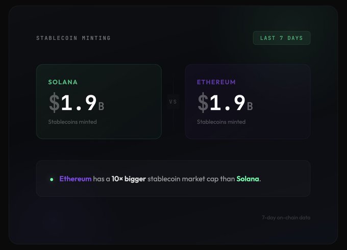 有趣的: Solana鑄幣廠鑄造了19億美元。 以太坊上鑄造了19億美元。 僅在過去7天內 儘管ETH的穩定幣市值是 Solana 的 10 倍,但仍有許多穩定幣在Solana上鑄造。 對Solana bulls來說是個好消息。