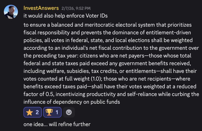 太棒了!幾天前我也發過類似的貼文… 根據淨納稅額賦予投票權: 如果您繳納的稅金多於獲得的福利 → 獲得全額投票權 (1倍) 如果您獲得的福利多於繳納的稅金 → 獲得半額投票權 (0.5倍) 目標:獎勵生產力,減少未支付額外支出而投票支持增加支出的動機。需出示選民證。 #拯救法案 #選民身分證 #馬克思主義 twitter.com/Investanswers/stat...