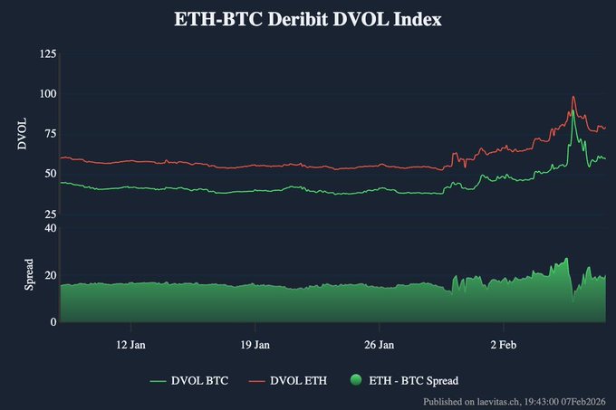 BTC跌至 6 萬美元,ETH跌破 1800 美元,引發Deribit隱含波動率指數的急劇飆升。BTCDVol 指數飆升至 90 波動率,單日漲幅約 35 個波動率點;ETHDVol 指數也攀升至 100 波動率,創下自 2022 年 11 月以來的最高水平。